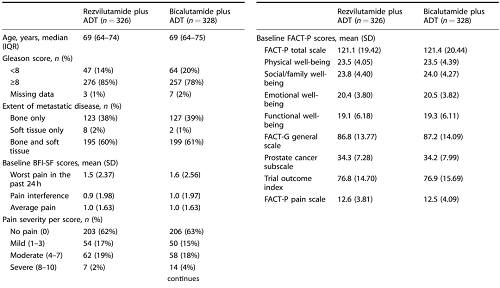 在整个研究中,BPI-SF和FACT-P的患者依从性很高,在第161周之前,两个治疗组的依从性均超过90%。只有25例患者(3.8%)错过三次或更多计划的疼痛评估。基线评估显示两组的疼痛水平较低,瑞维鲁胺+ADT组中有203例(62%)患者、对照组中有206例(63%)患者在基线时报告无疼痛,仅分别有17%和15%的患者报告轻度疼痛。基线FACT-P评分表明,瑞维鲁胺+ADT组和对照组的功能状态相似。